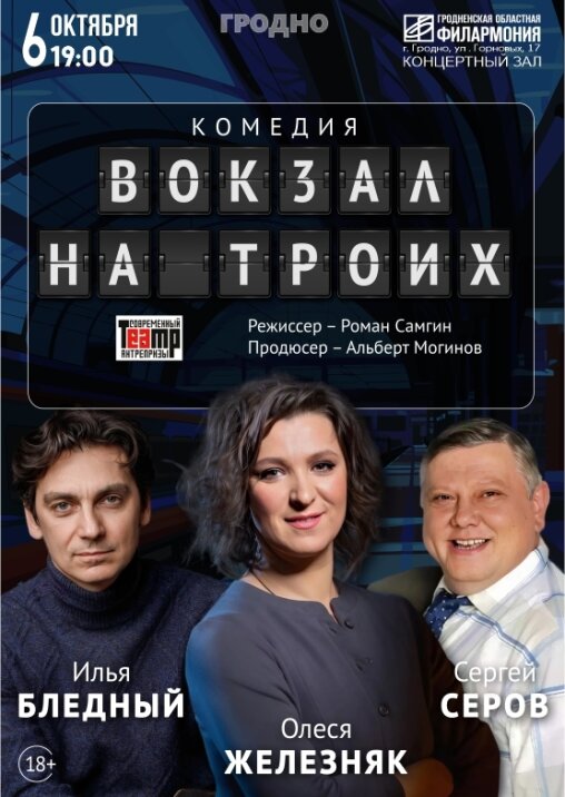Что произойдет, если в одно время в одном месте встретятся люди, которые, ни при каких условиях, казалось бы, не могут оказаться рядом? Тем более, за одним столом… Что будет, если на одной сцене «соединить» умопомрачительного красавца и утонченного эстета Илью Бледного, и самую «смешную» отечественную актрису Олесю Железняк? Что ждет зрителей, если к этой «странной» компании примкнет талантливый бармен, простите, артист Сергей Серов?В искрометно смешном спектакле мир гламура и глянца сталкивается с проблемами реальной российской действительности. Эта история - про нас сегодняшних, со всеми нашими страхами и надеждами. И пока мы смотрим спектакль и отвечаем на вопросы, возникающие «по ходу пьесы», и с нетерпением ждем, к чему приведет столь странная встреча героев, нас ждет зрелище достойное его величества Случая. Нас ждет ярчайшая комедия характеров. Эти ингредиенты смешиваясь, становятся «Вокзалом на троих» - умным и смешным спектаклем. В нем есть еще тонкий лиризм и наше всегдашнее ожидание счастья… за новым поворотом жизненного пути.